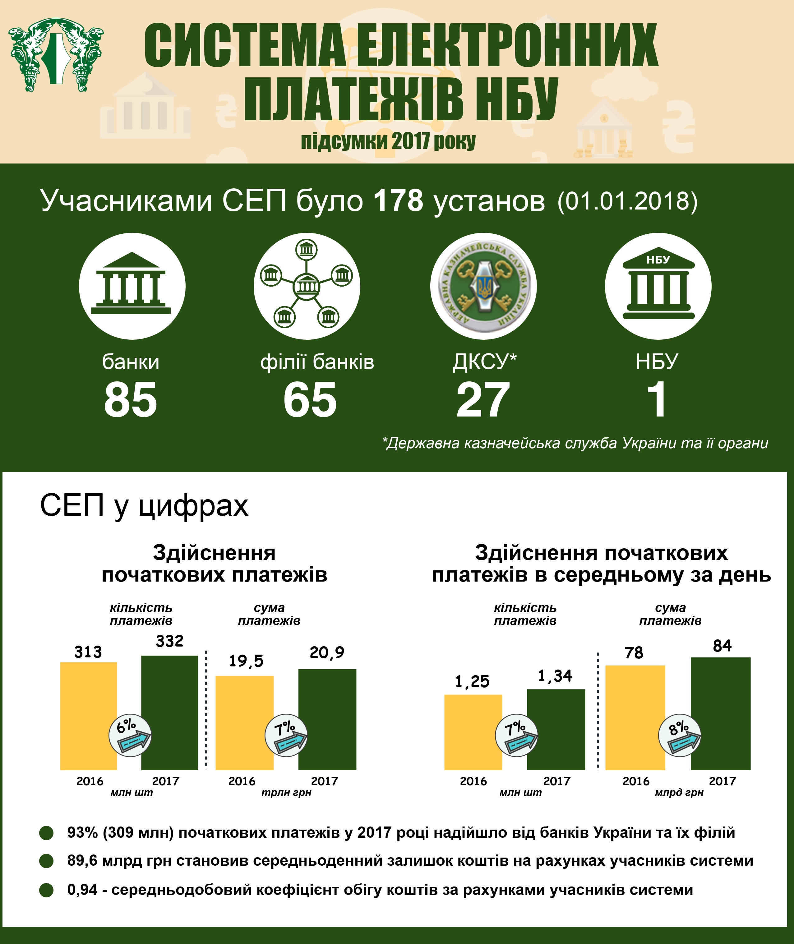 Упродовж 2017 року в СЕП у середньому за день оброблялося 1 337 тис. початкових платежів на суму 84 млрд грн.